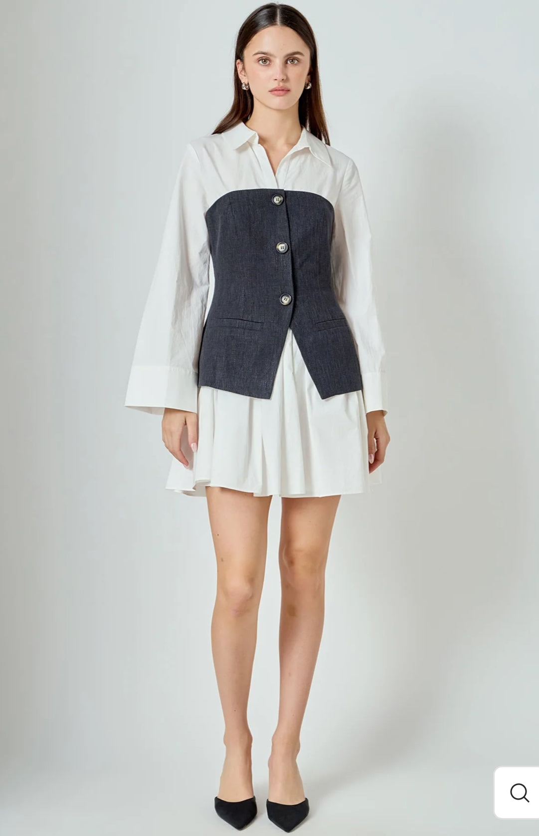 Make a statement in our Mixed Media Tweed Poplin Mini Dress. This dress combines the classic textures of tweed and lightweight poplin for a unique and stylish look. The mini length adds a touch of fun, while the collar adds a touch of sophistication. Perfect for both formal and casual occasions, this dress is a versatile must-have in your wardrobe. Pair it with heels for a dressy look or with boots for a more relaxed vibe. Elevate your style game with this must-have dress that seamlessly blends timeless tweed and modern poplin.